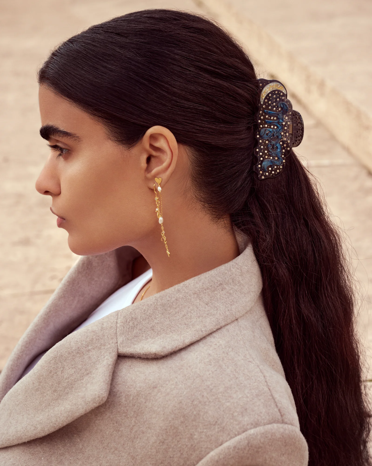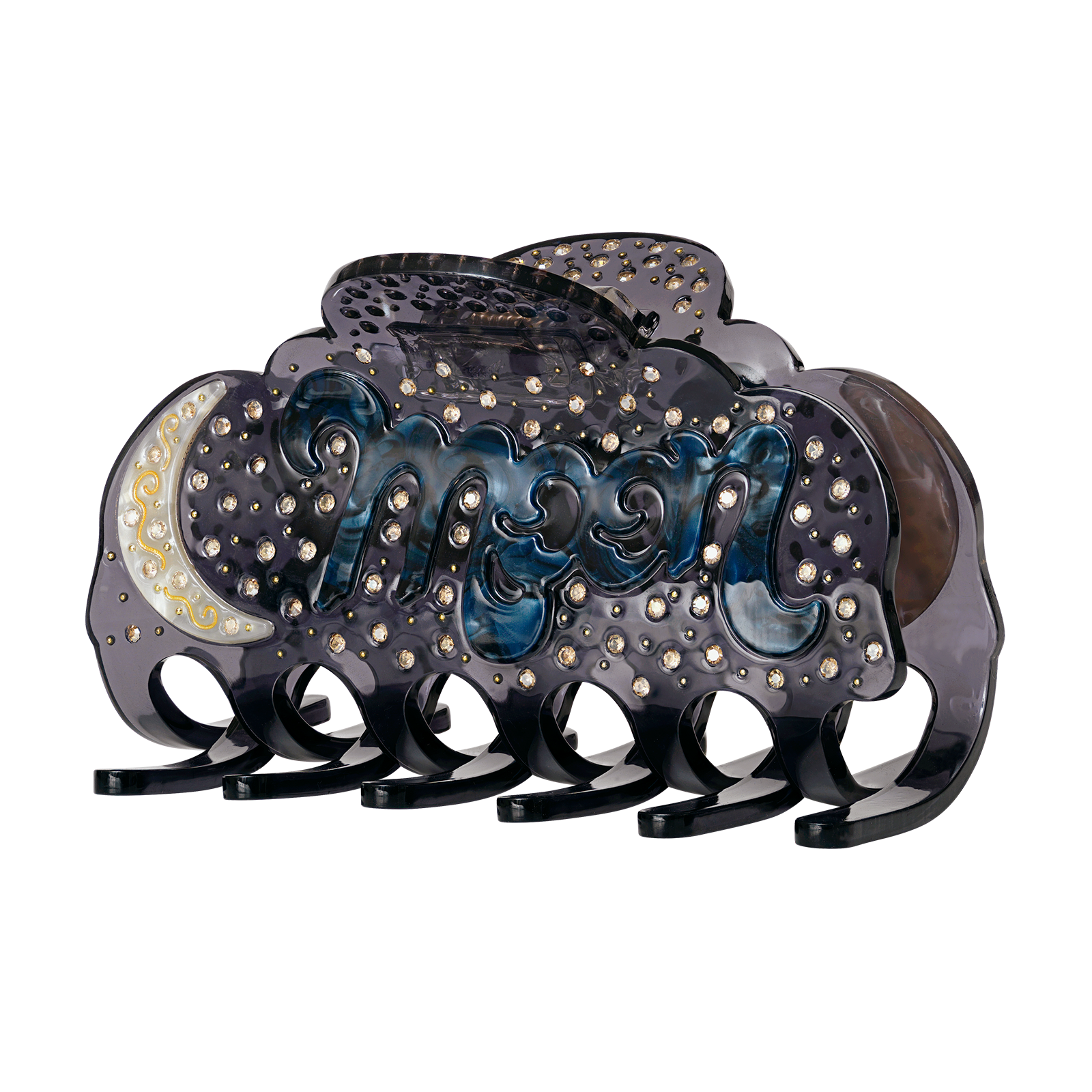 Den magiske hårklemme, Cosmo, er dekoreret med en skinnende halvmåne, og så er ordet Moon skrevet på fineste vis. Den er skabt i et transparant sort acetat og dekoreret med lyse krystaller, der ligner stjerner på nattehimlen.