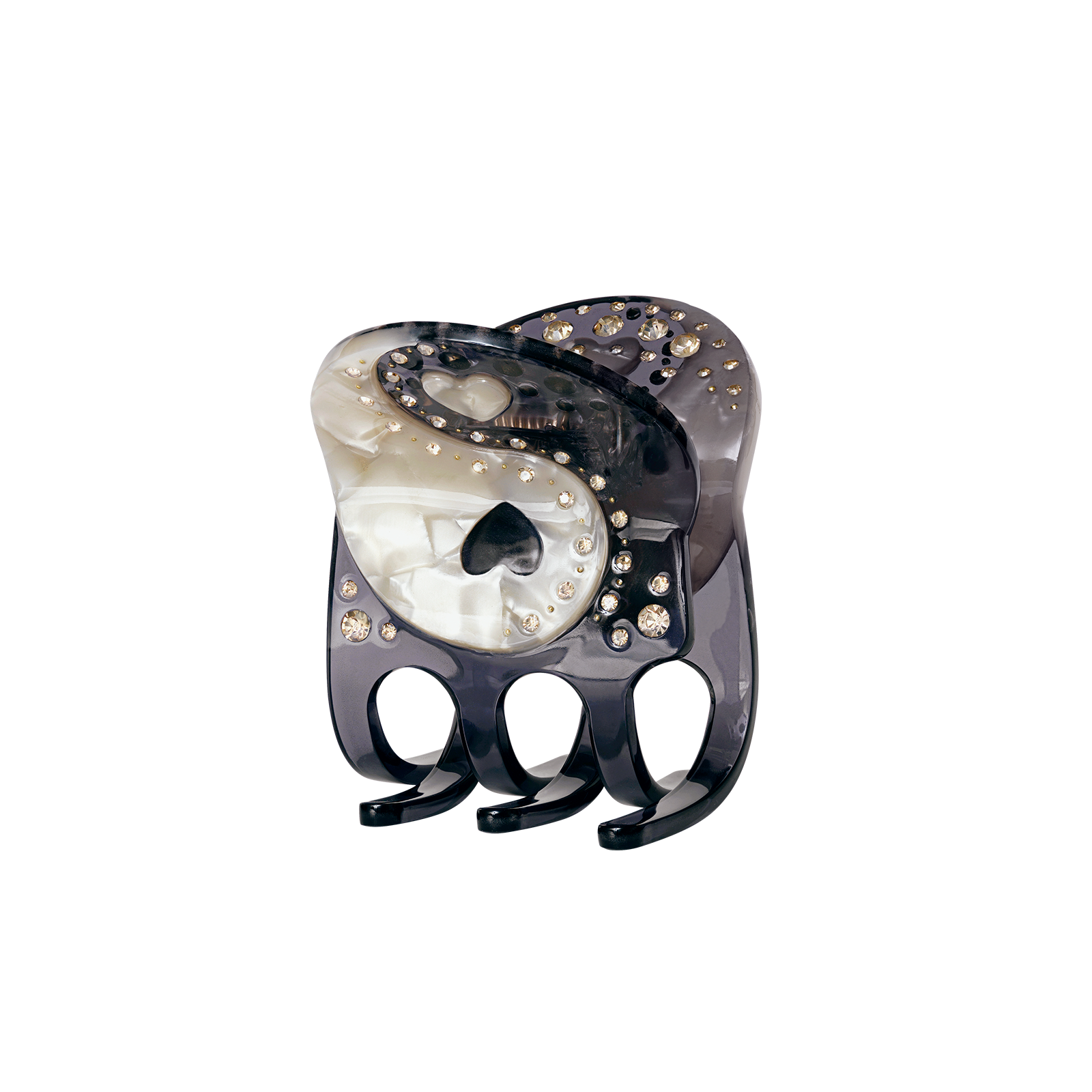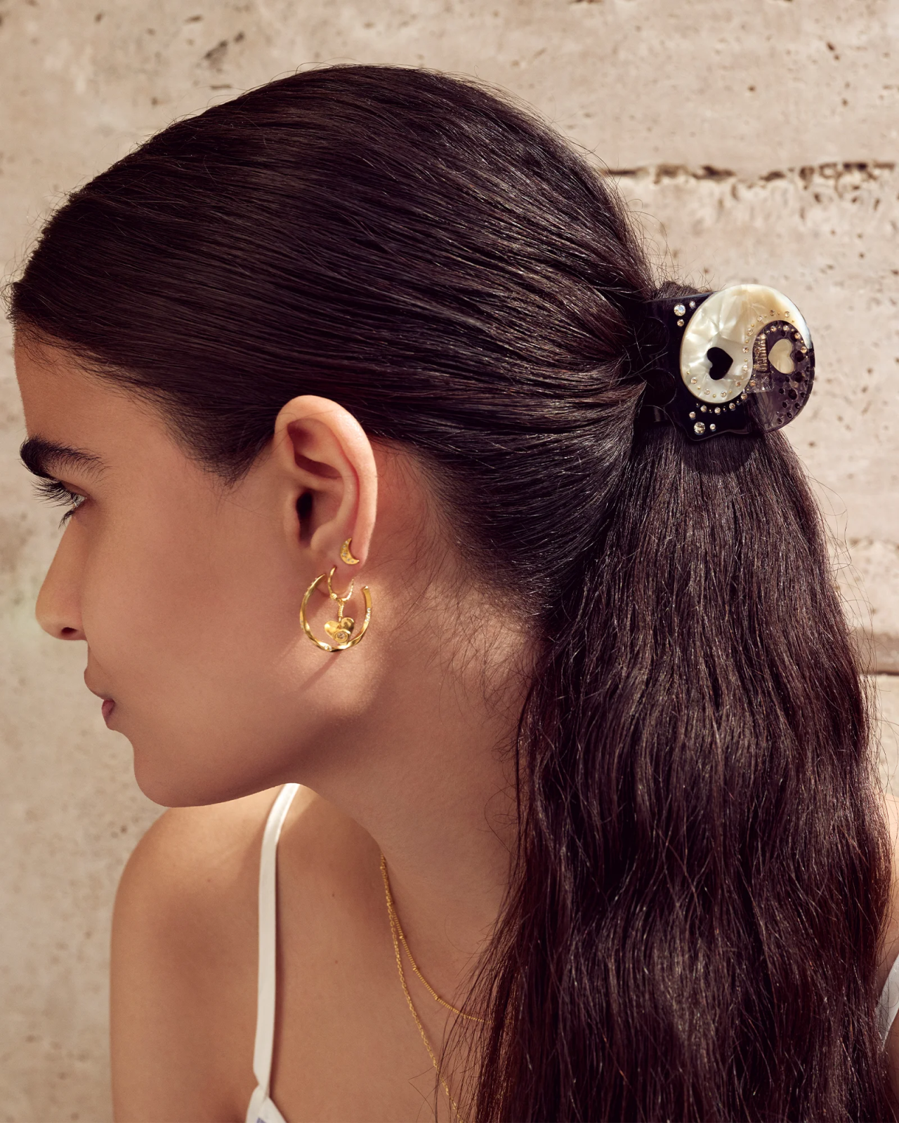 Maanestens fine hårklemme, Despina, er skabt som et balancerende yin og yang-motiv, der giver dit look magiske vibes. Den er lavet af et transparent sort og iriserende hvidt acetat og udsmykket med lyse krystaller.