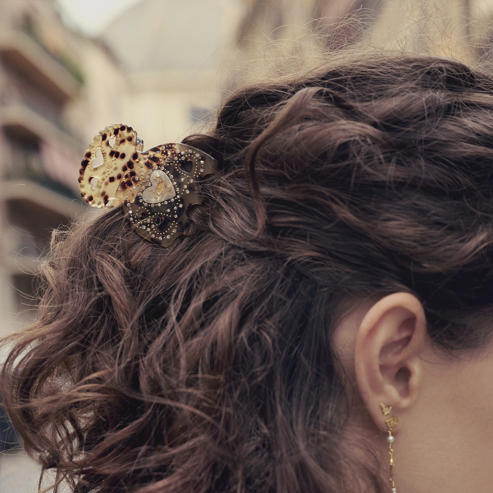 Vores Pantalone Hårklemme er en delikat omfavnelse af funklende rhinstensgnister og kærlige hjerter.