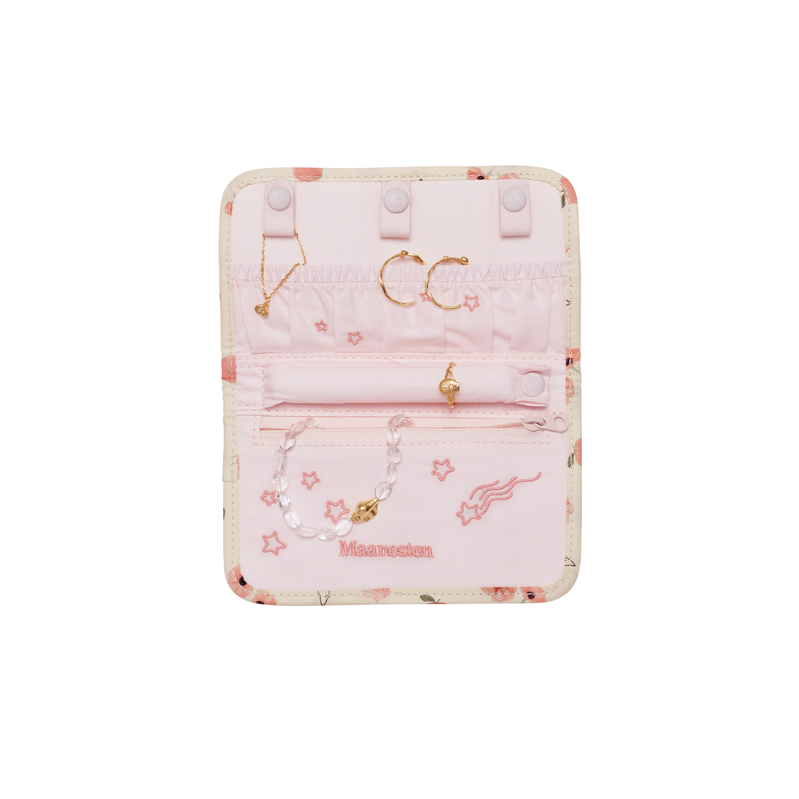 Hold dine elskede smykker i sikker forvaring med vores Smykke Clutch, med et print af roser og muslinger. Det er en yndefuld hyldest til Afrodite og forener æstetik med praktik i fuldendt tidløs elegance.