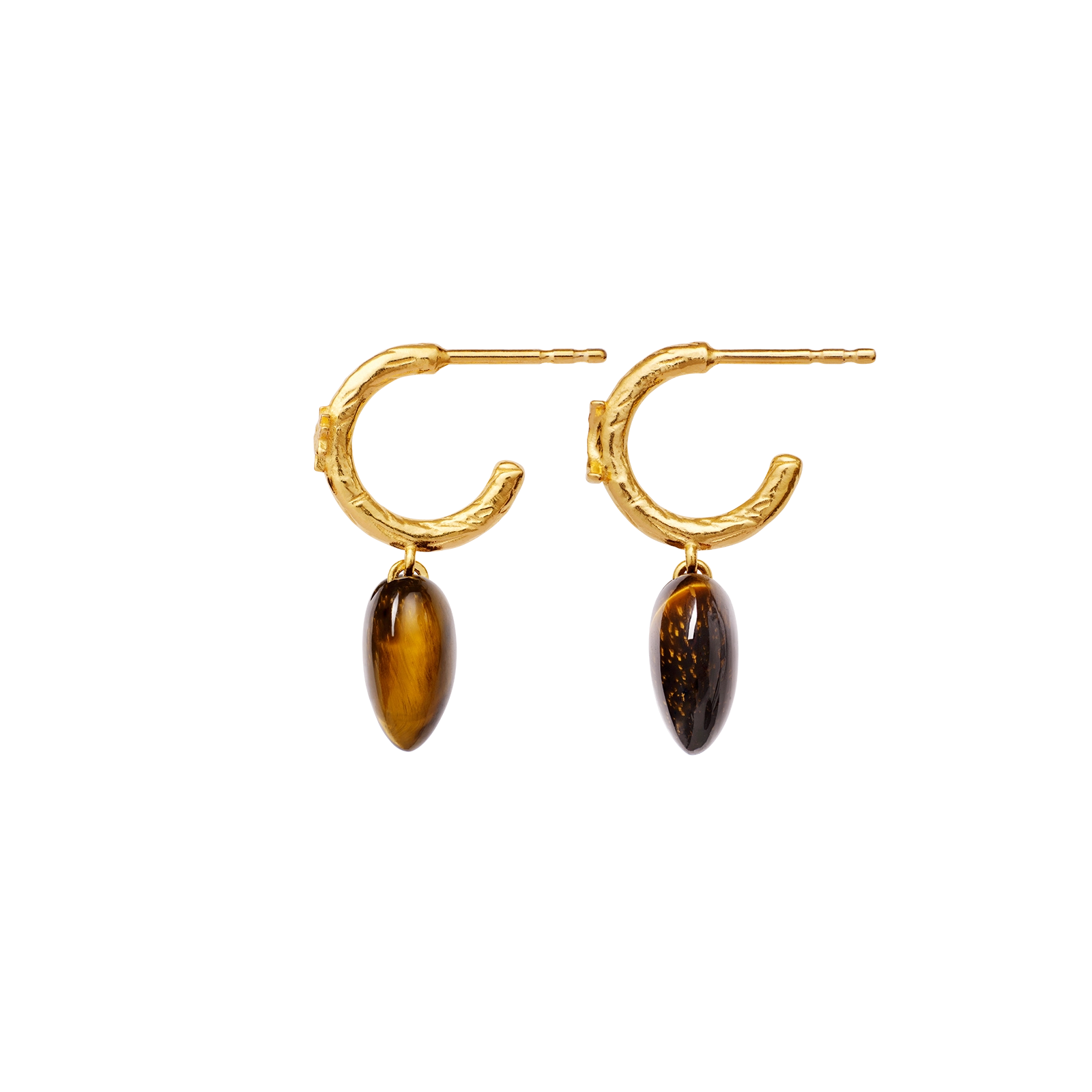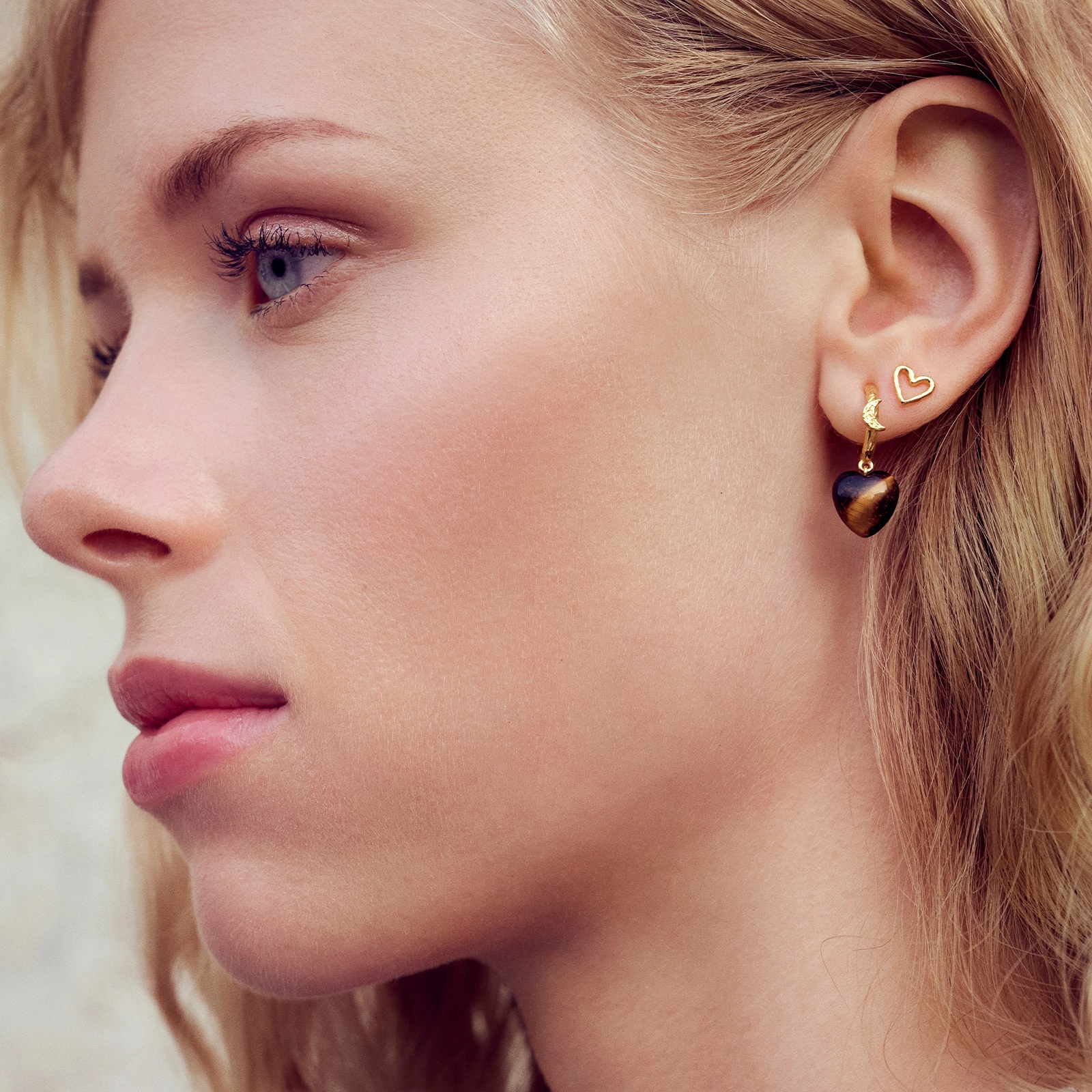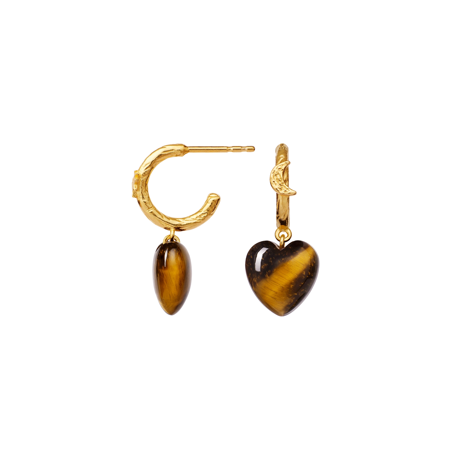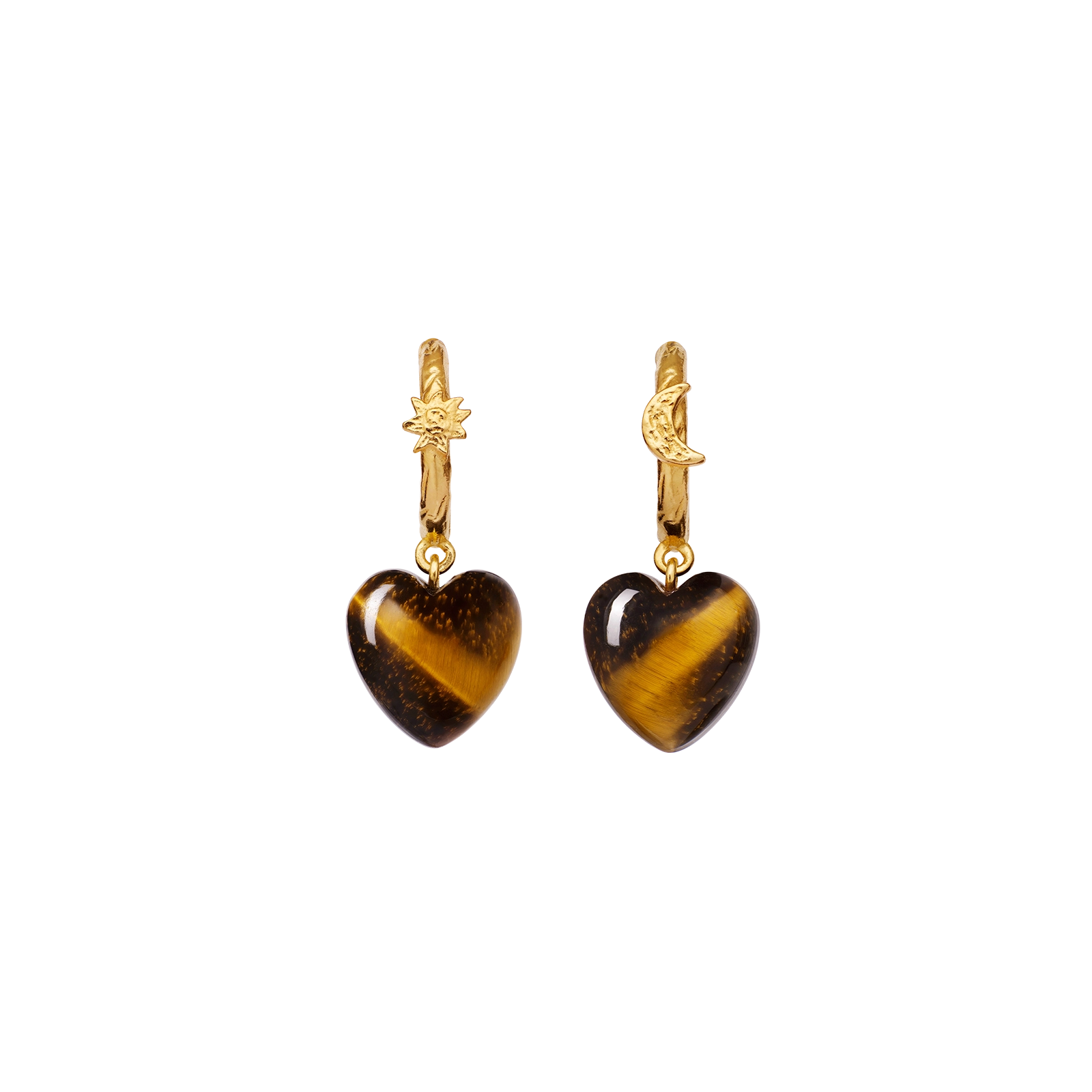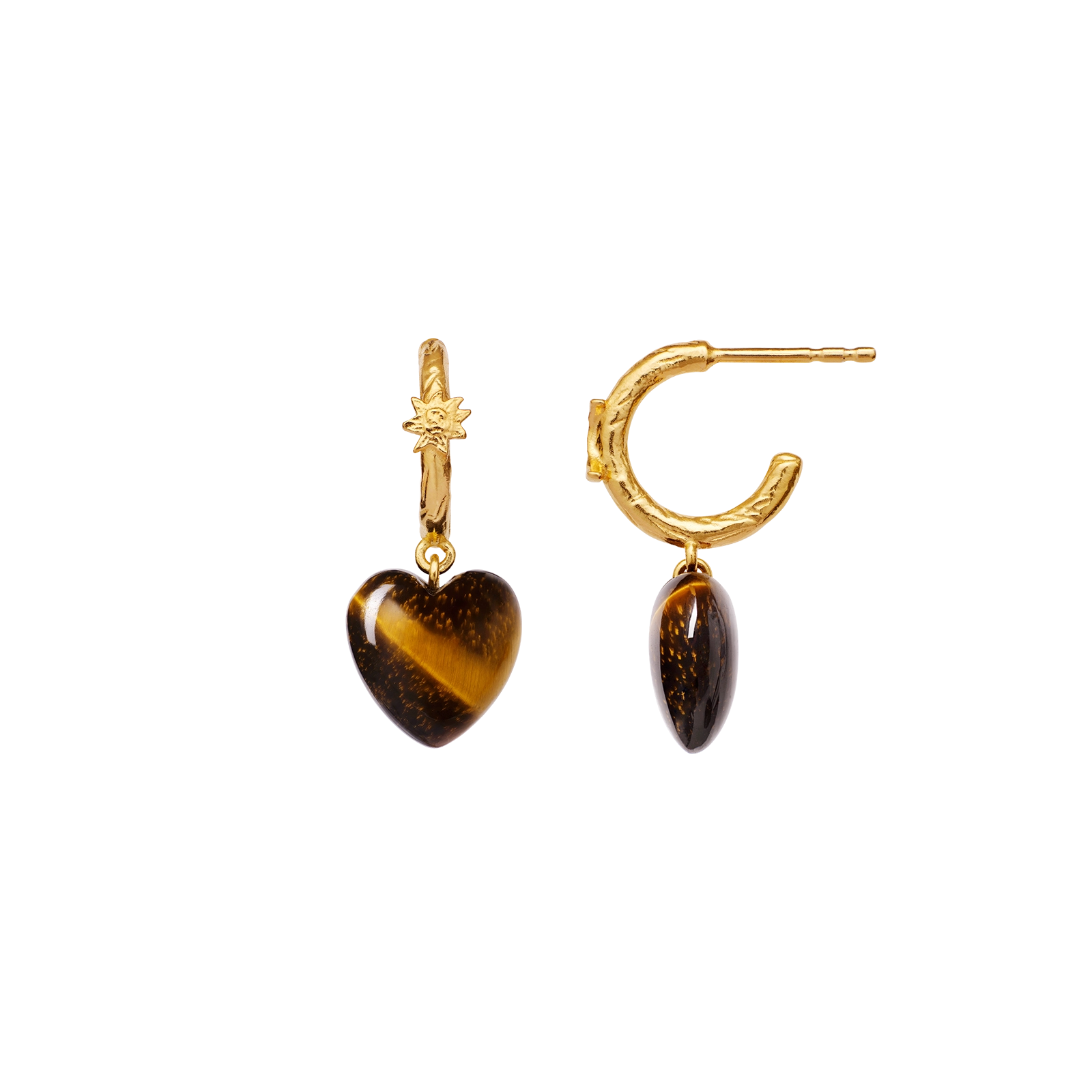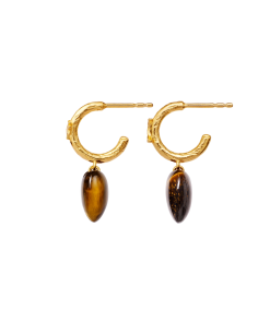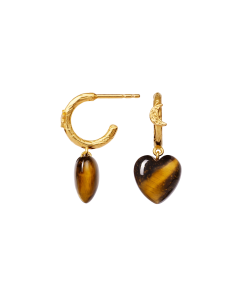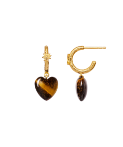 Vores Abundance Øreringe er din talisman til, at gribe den overflod livet byder på. To gyldne creoler omkranser øret og balancerer de hjerteformede tiger øje-vedhæng, som kan tiltrække alt i vækst.