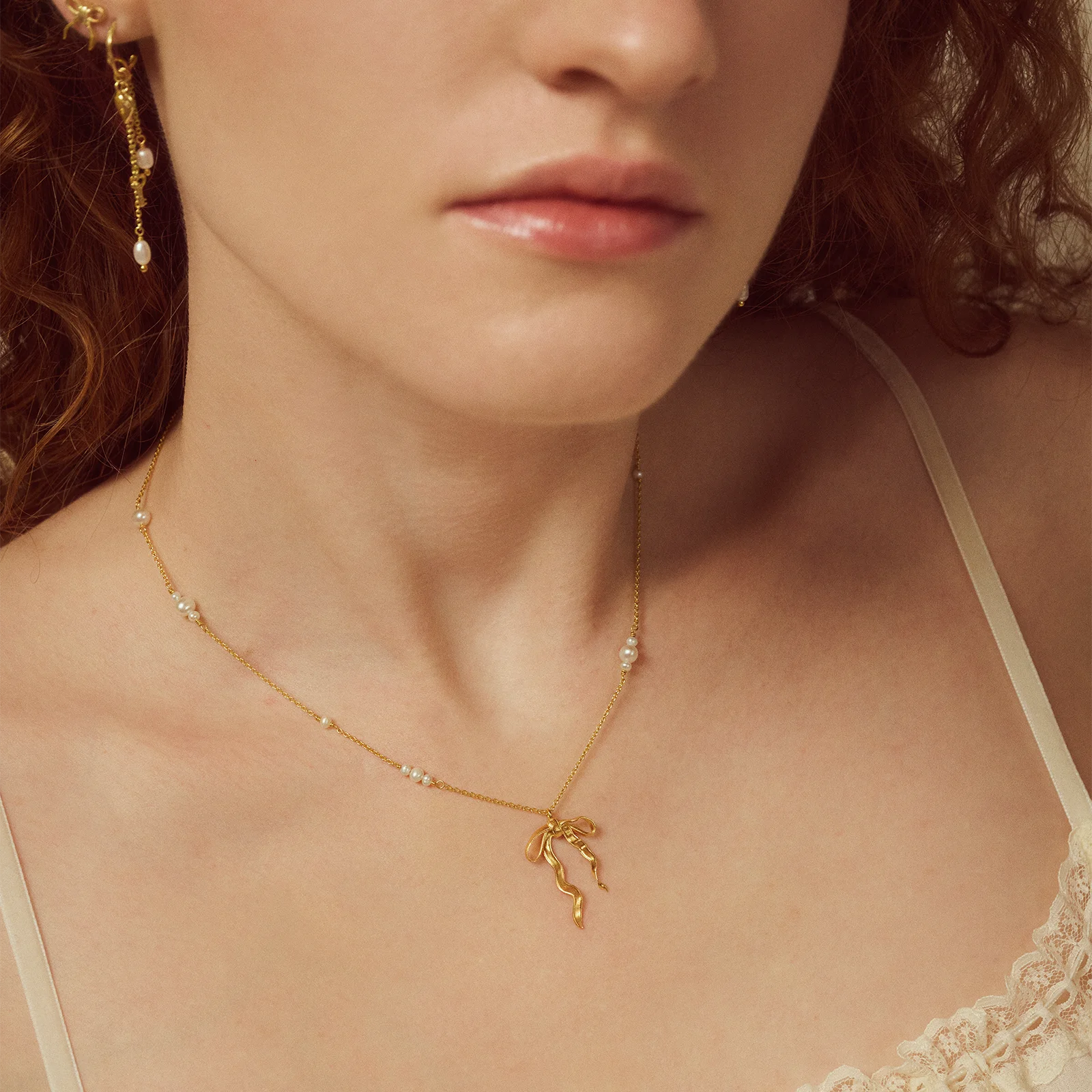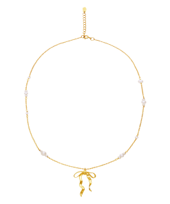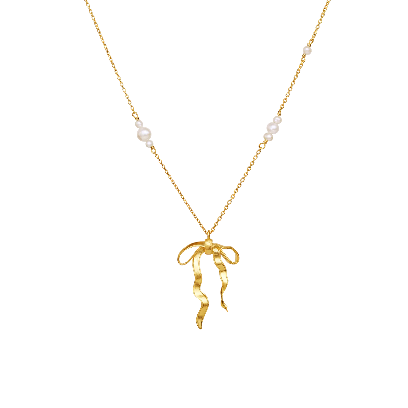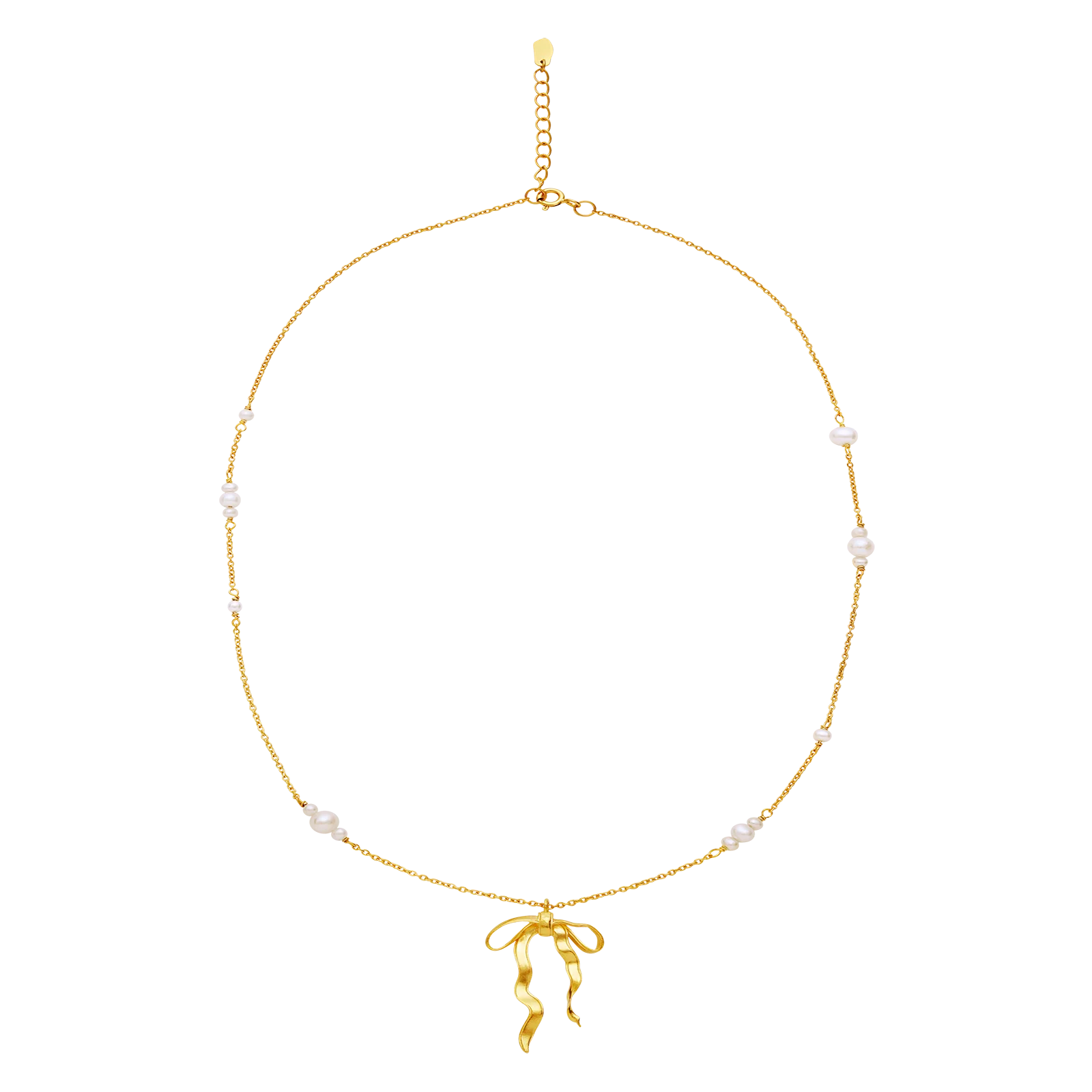 Med ferskvandsperler og søde sløjfer er Effie halskæden et drømmende og elegant smykke, der løfter dit hverdagslook.Materialer:Genanvendt sterlingsølv (925) belagt med 18 karat guld og hvide ferskvandsperlerStørrelse: Kædelængde 39 – 42 cm