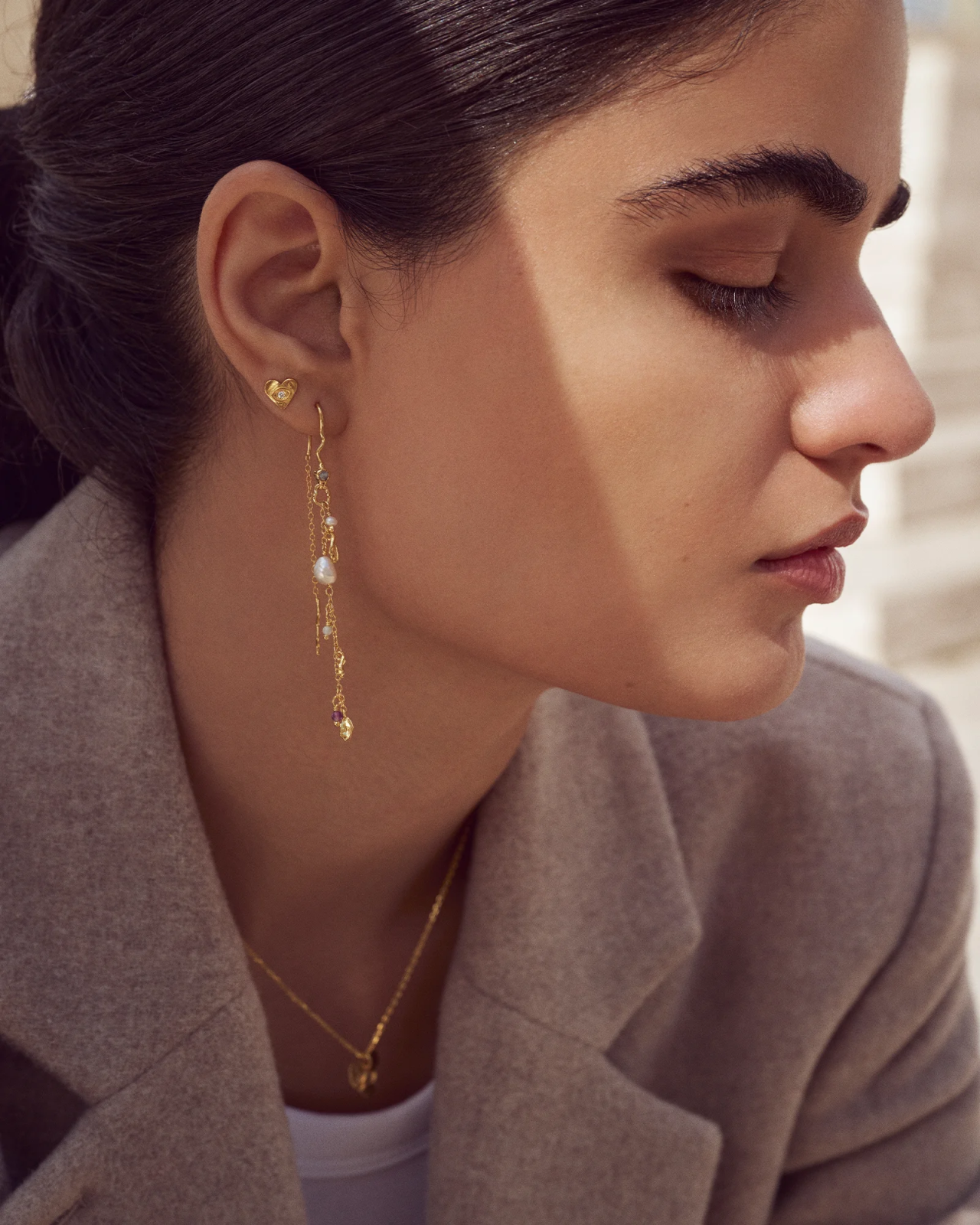 Som romersk gudinde for familien er Vesta hjemmets hjerte og brændende ild, og i Vesta Earrings er gudindens uvurderlige arbejde symboliseret i hjerteformen og ferskvandsperlen, der står for harmoni.